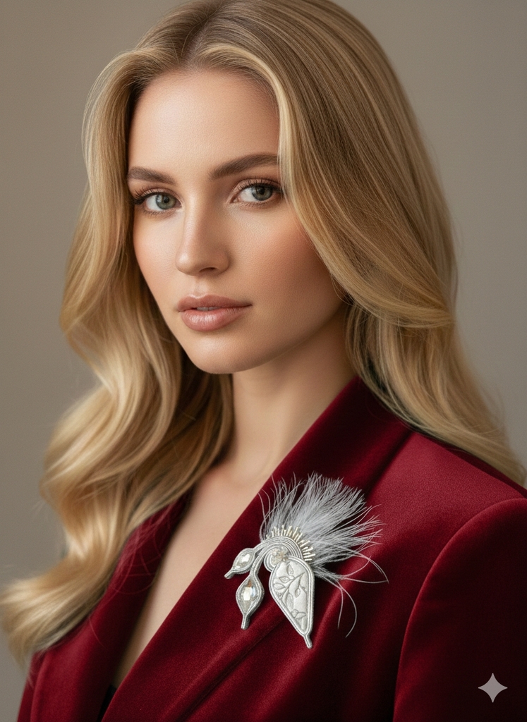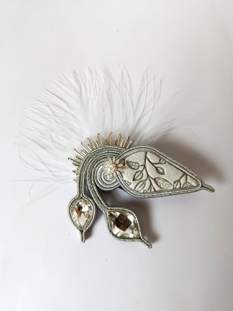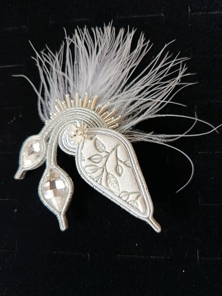*Cabochon artisanal, cristaux, perles Miyuki en plaqué argent, plume d’autruche, soutache.