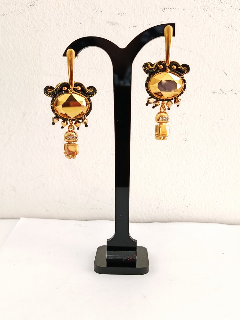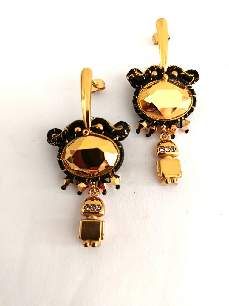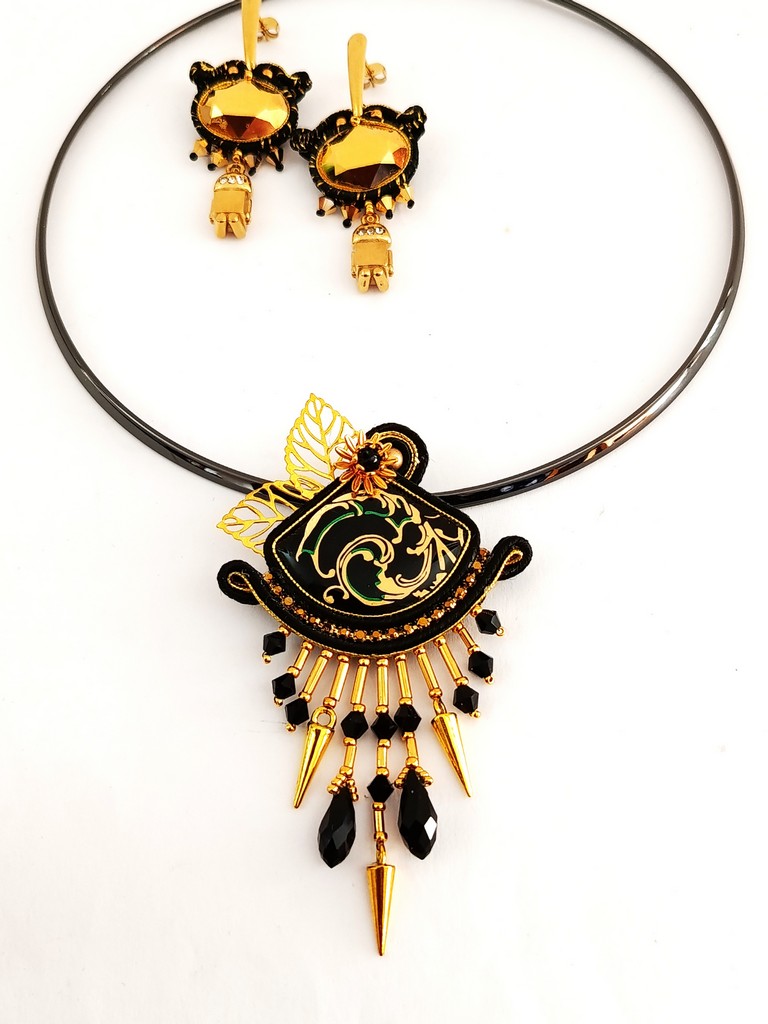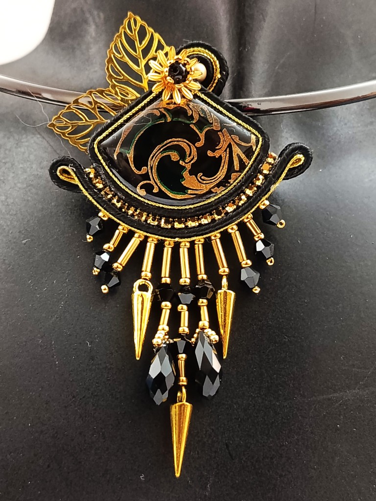 *Cabochon fait main , cristaux, verre de Bohême, chaîne de strass, perles Miyuki, montage cousu main en technique “soutache”.