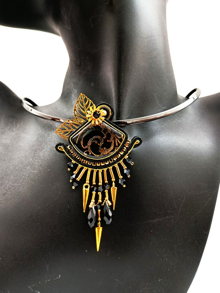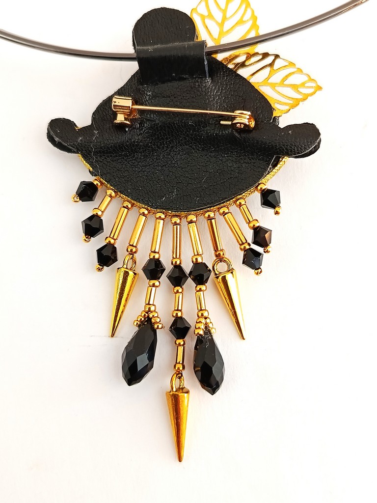*Le tour de cou rigide de 3mm est en laiton galvanisé black nickel. Les éléments métalliques ( spikes, feuilles filigranées, épingle de broche) sont sans nickel, sans cadmium et sans plomb..
